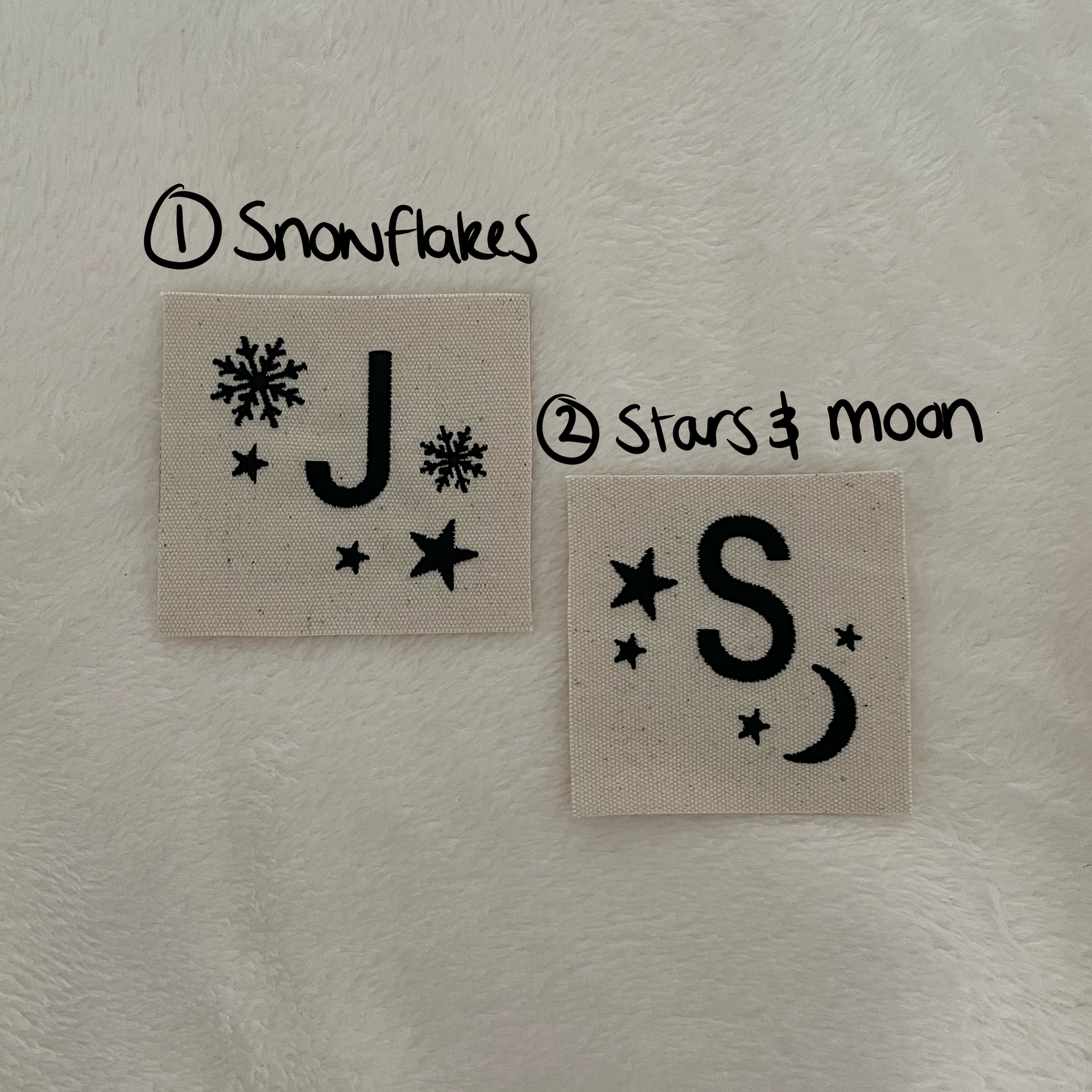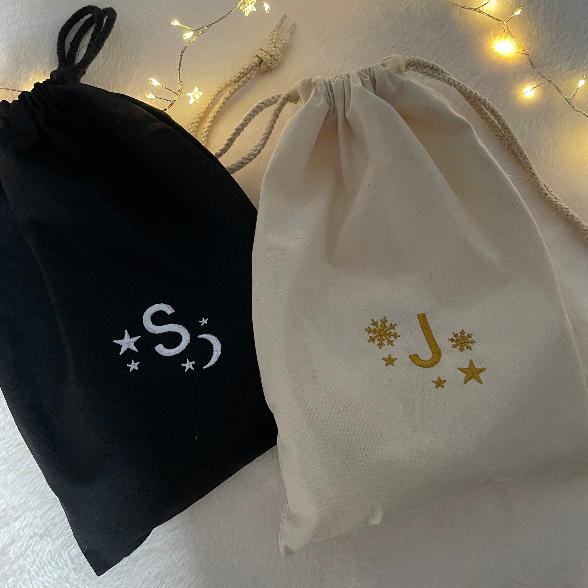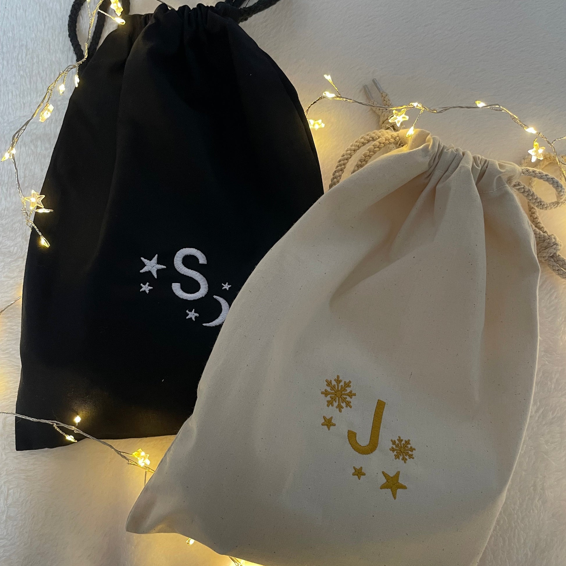 Custom initial drawstring bag with snowflakes. Perfect little stocking filler.
